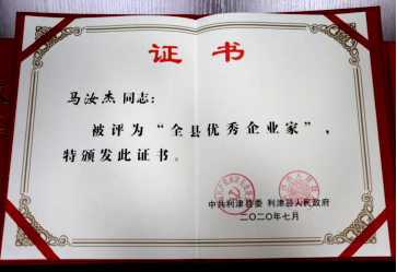 祝賀董事長(zhǎng)馬汝杰榮獲“全縣優(yōu)秀企業(yè)家”稱號(hào)